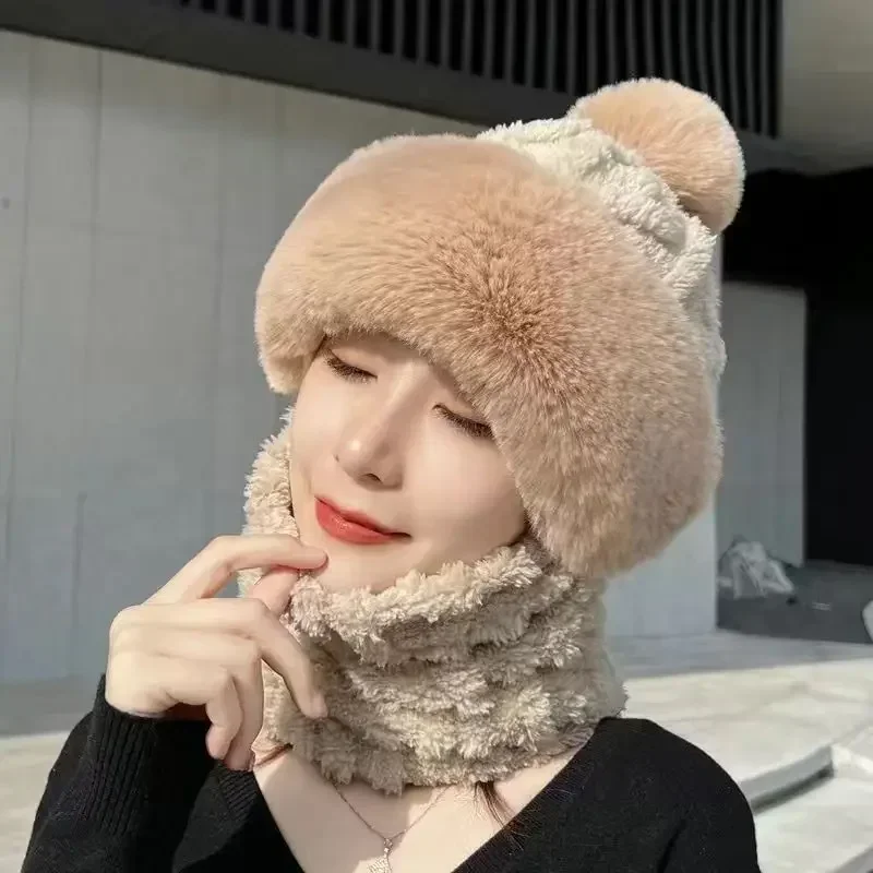 Women's Winter Pom Pom Beanie Hat Scarf Mask - One-Piece Fleece Bonnet